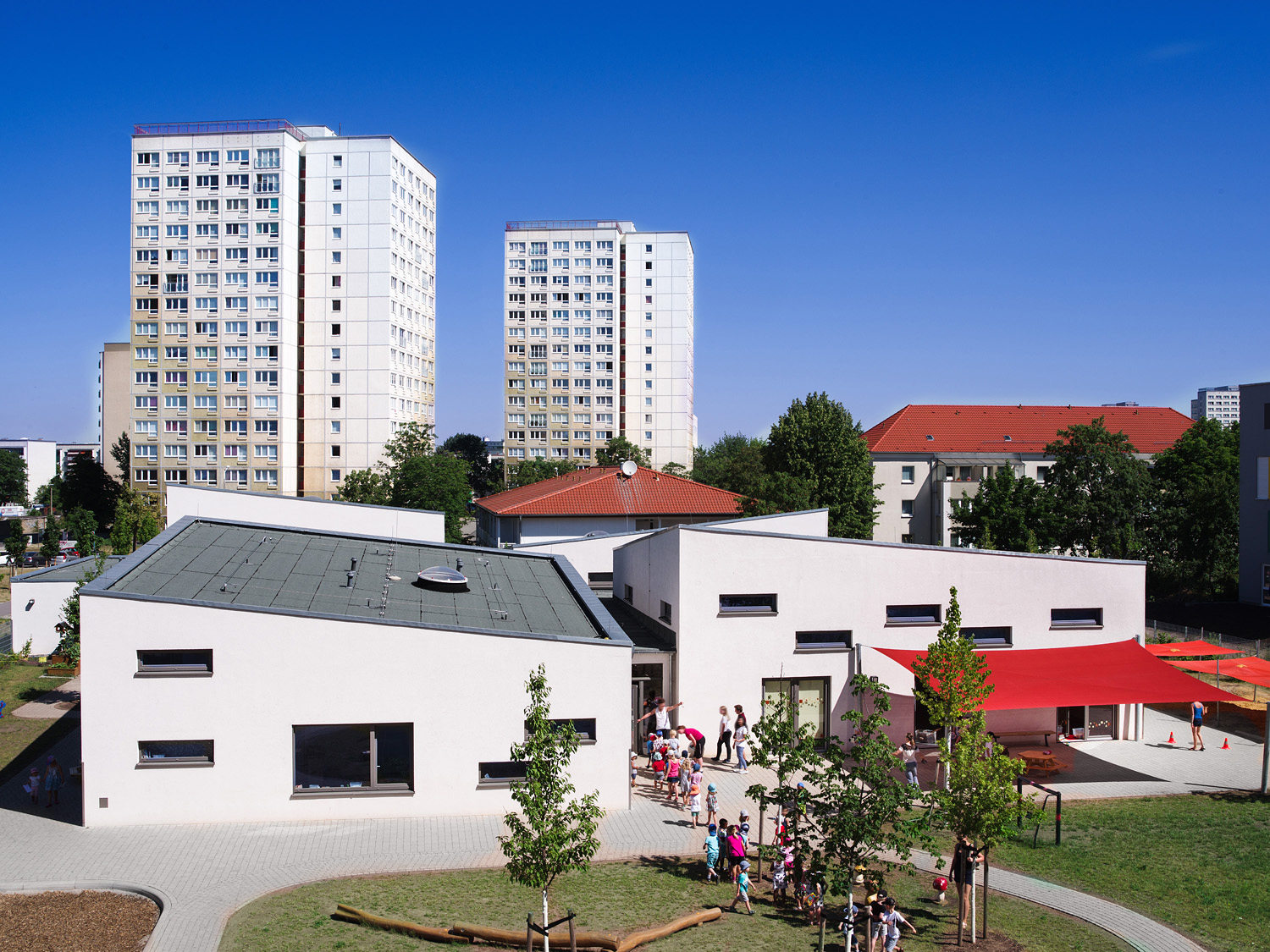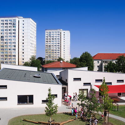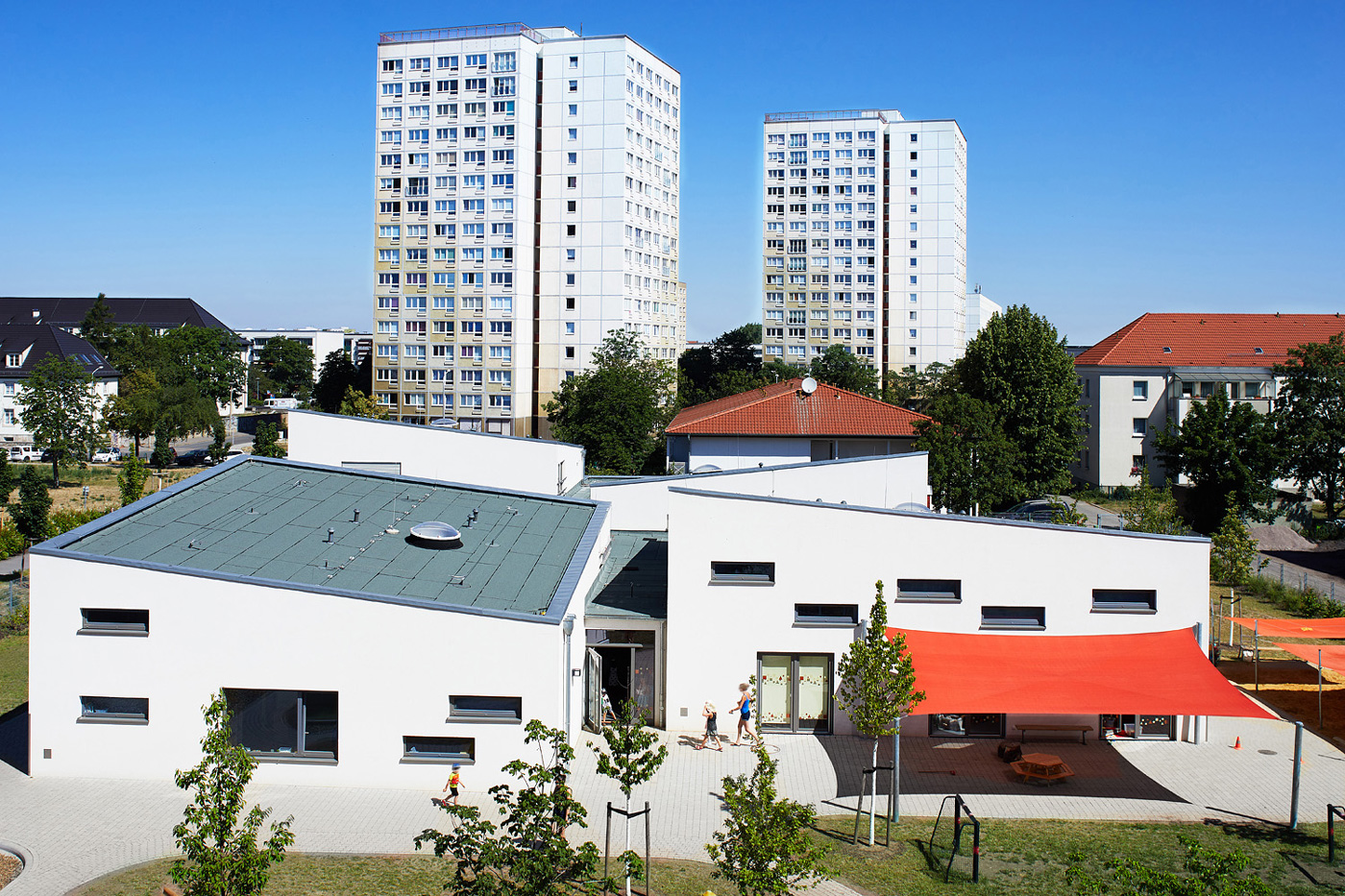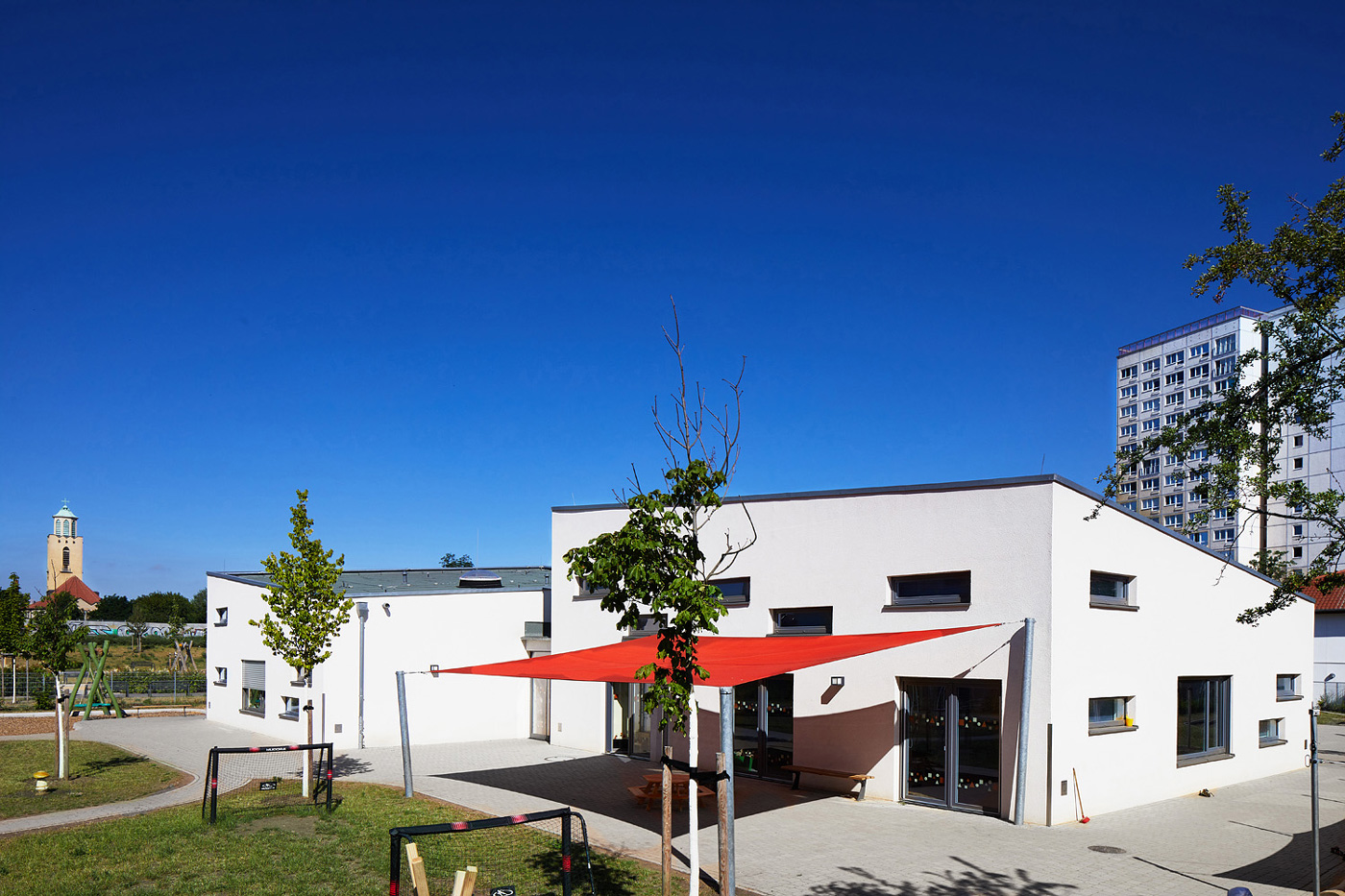 Die KITA-Johannesfeld wurde als Werkstatt für Kinder geplant: Hier kann sich das freie Spiel entwickeln, das Fühlen, die Motorik, die Fantasie sowie die Kreativität der Kinder gefördert werden. Innerhalb des vorgegebenen Baufeldes entfaltet sich der Baukörper mit 4 in der Höhe gestaffelten und in der Dachform dreidimensional geschrägten Kuben. Aus dem eingeschossigen Volumen der Erschließungsfläche brechen die Familieneinheiten horizontal wie vertikal mit gestapelten Ebenen aus.