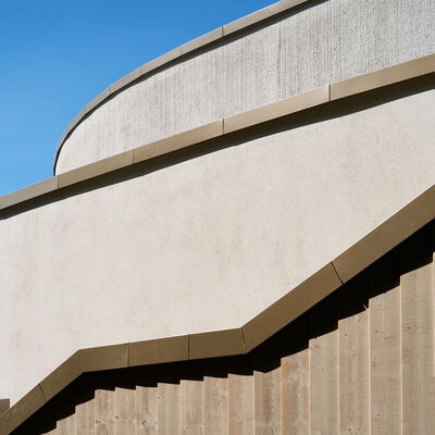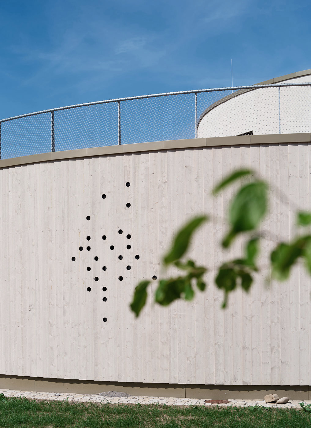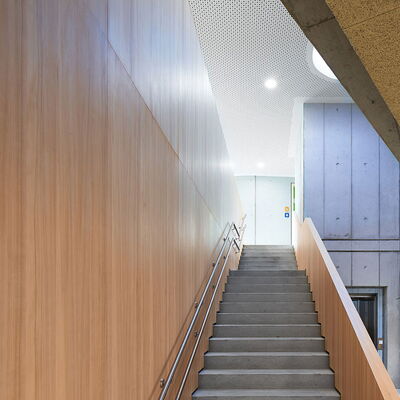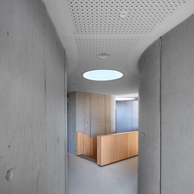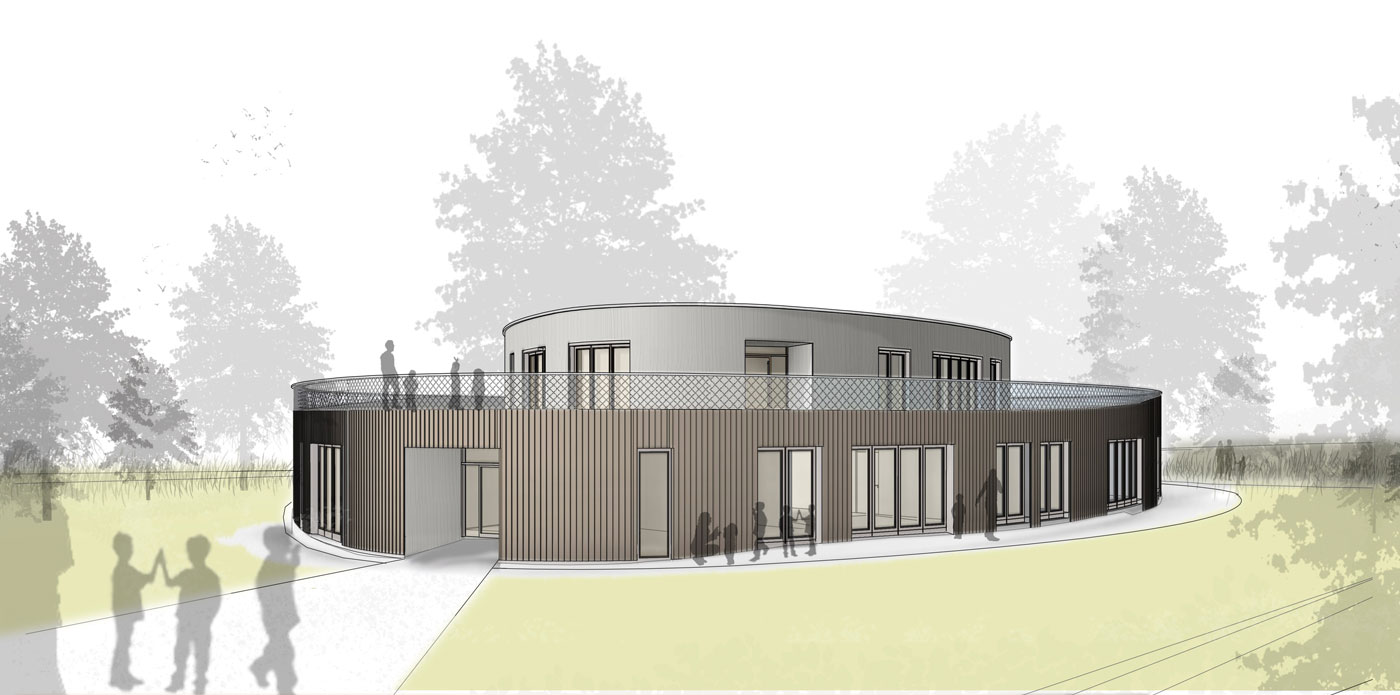 Der frei geschwungene Baukörper ist identitätsstiftend und ein kraftvoller Abschluss der umgebenden Wohnbebauung. Gleichzeitig liegt er, fließend eingebunden mit den Funktionen der Freibereiche, in dem sich öffnenden Grünzug. Der großzügige Windfangbereich ist Ankunftsort, Marktplatz und Verteiler, zentral als Auftakt des Gebäudes gelegen.