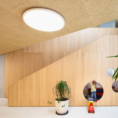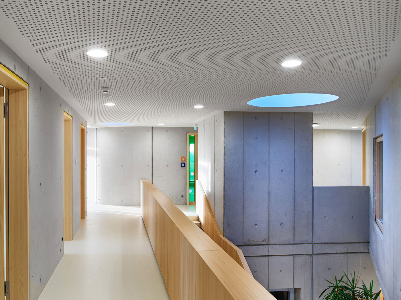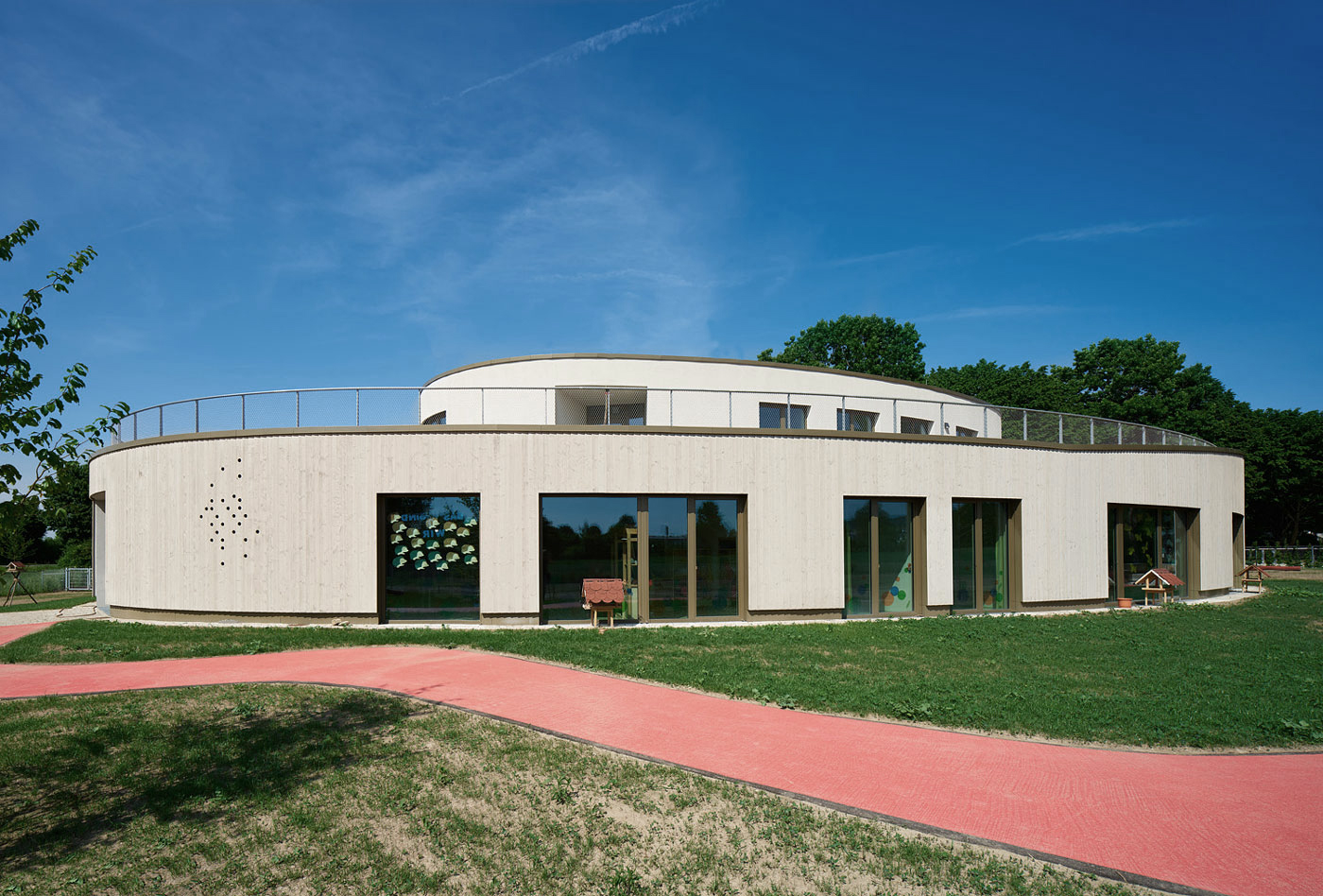 Barrierefrei und ebenerdig liegen die wesentlichen Funktionen Krippe, Kindergarten und der Wirtschaftsbereich im Erdgeschoss. Die stringente Anordnung der Gruppenräume ermöglicht die logische Verknüpfung von Stammgruppen und Funktionsräumen. Die Räumlichkeiten für Elterngespräche und die Sozialarbeit für Kinder mit Migrationshintergrund sind bewusst im Obergeschoss untergebracht. Diese werden von dem zentralen Marktplatz im Erdgeschoss aus erschlossen.