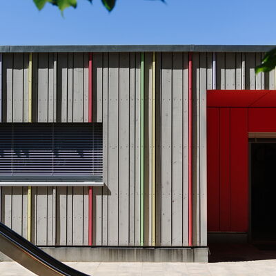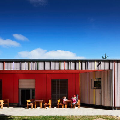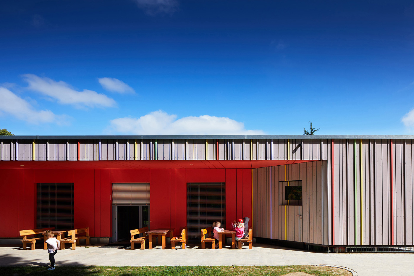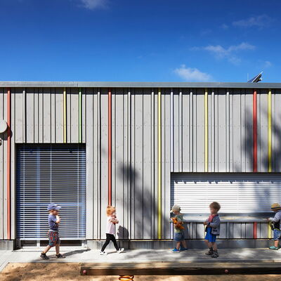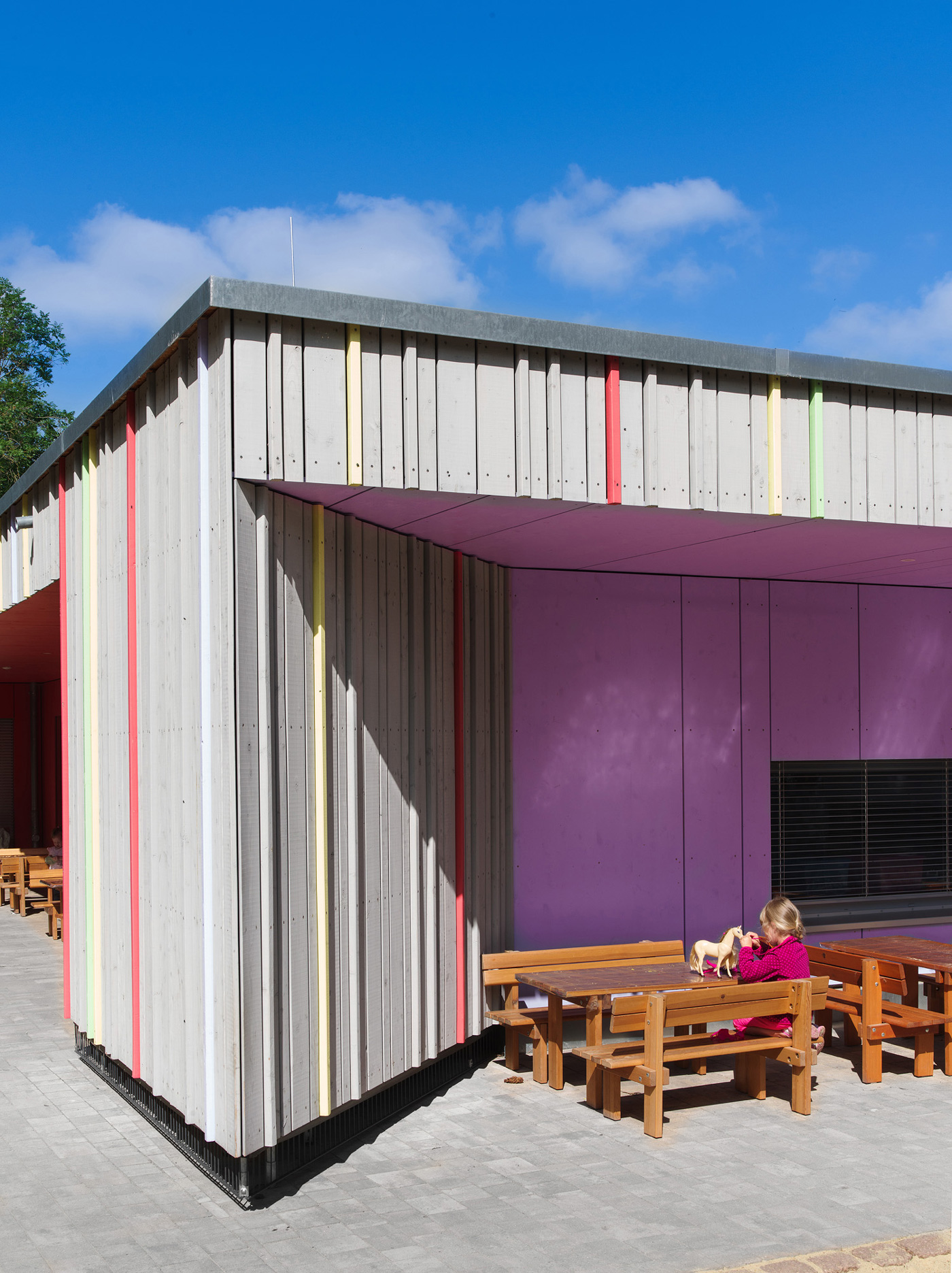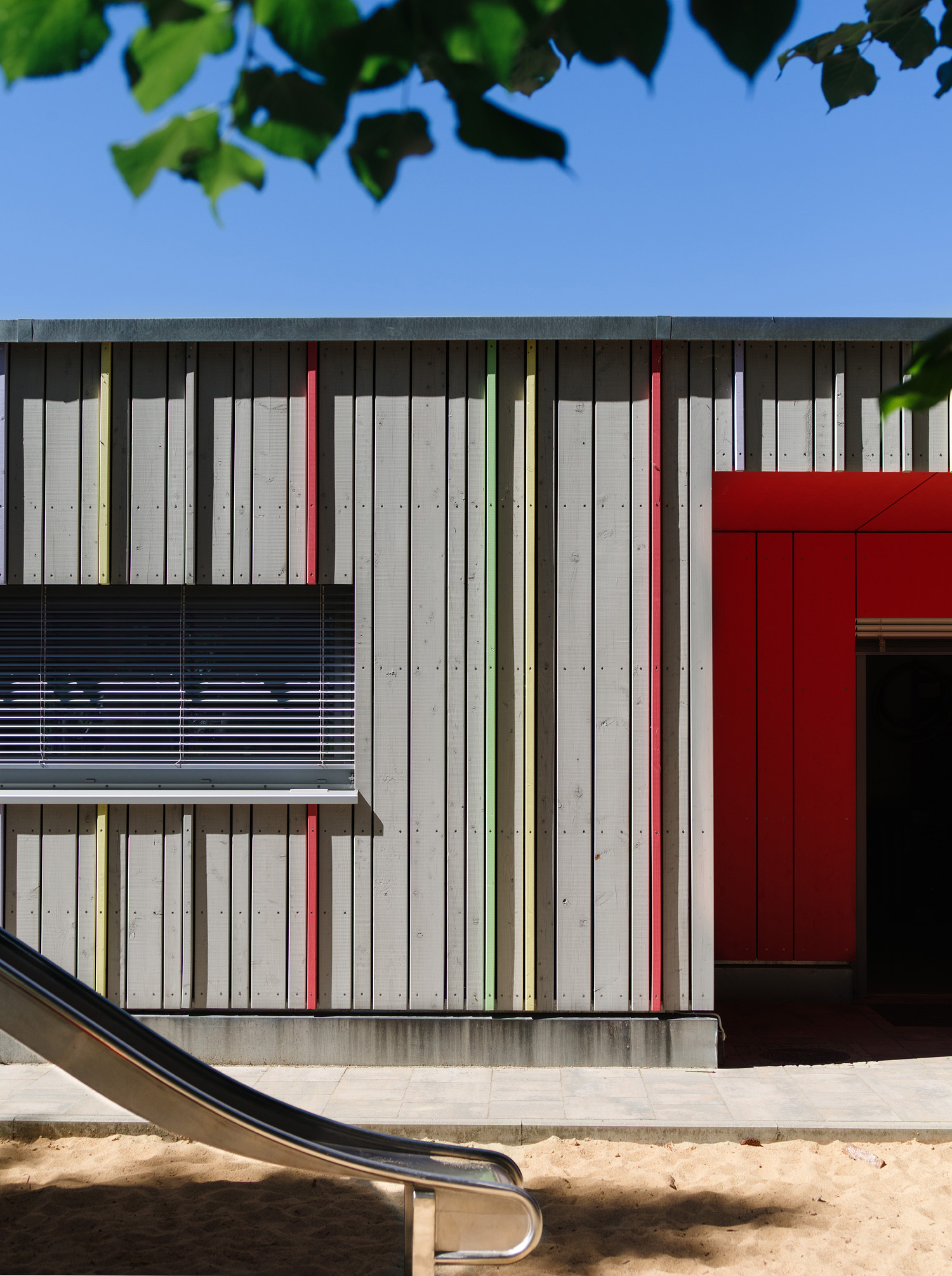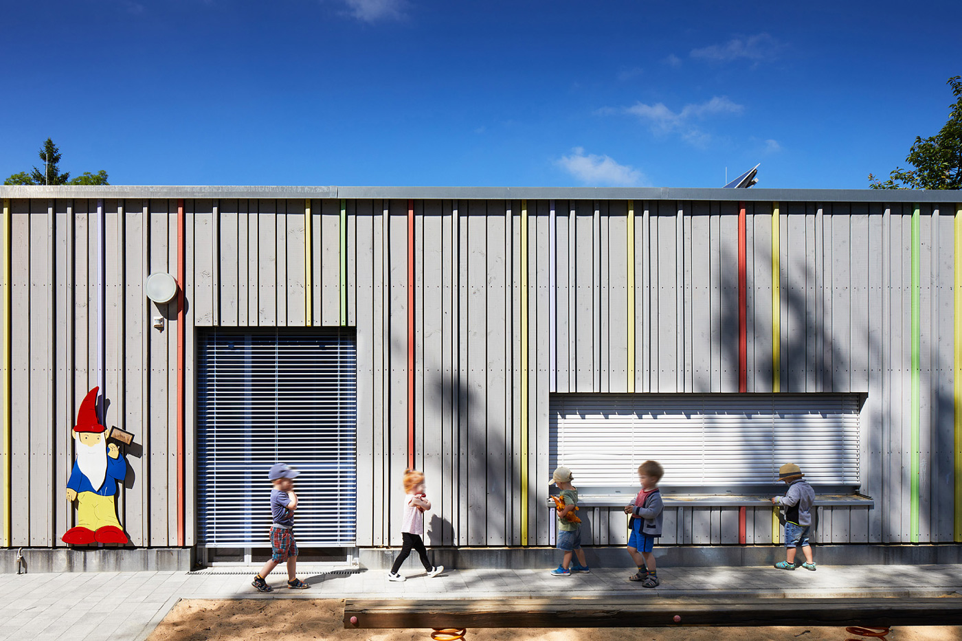 Der neue Kindergarten bietet Platz für mehr als 40 Kinder. Alle Gruppenräume und der Mehrzweckraum haben vorgelagerte Terrassen mit Ausgängen unmittelbar in den Außenbereich. Dies soll dem pädagogischen Modell folgend, den Bezug der Kinder zur Umwelt schärfen. Dementsprechend wurde das Gebäude vorrangig aus nachwachsenden Rohstoffen, auch durch die markante Holzschalung als Fassadenbekleidung ablesbar, errichtet.