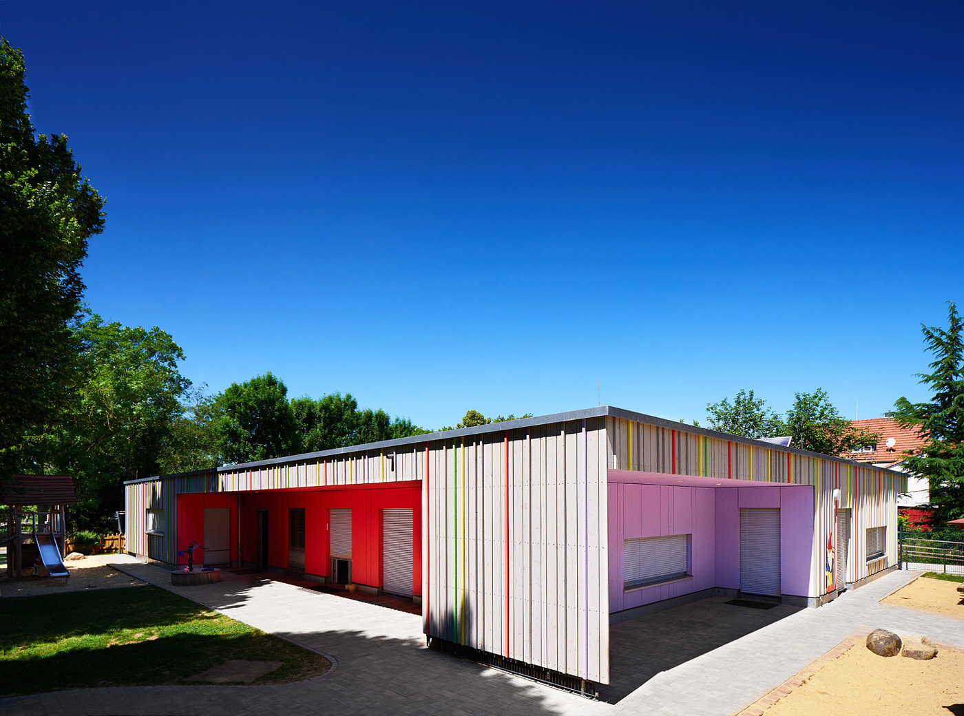Der Kindergarten ersetzt den Vorgängerbau aus den 1930er Jahren, der aufgrund der heutigen statischen Anforderungen nicht mehr erweiterbar war. Der eingeschossige Neubau unterteilt sich in einen Gruppenraum für die Kindergrippe und 3 Gruppenräumen für den Kindergarten, mit jeweils eigenem Zugang.