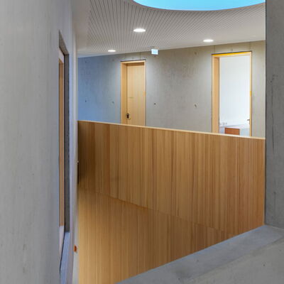 Barrierefrei und ebenerdig liegen die wesentlichen Funktionen Krippe, Kindergarten und der Wirtschaftsbereich im Erdgeschoss. Die stringente Anordnung der Gruppenräume ermöglicht die logische Verknüpfung von Stammgruppen und Funktionsräumen. Die Räumlichkeiten für Elterngespräche und die Sozialarbeit für Kinder mit Migrationshintergrund sind bewusst im Obergeschoss untergebracht. Diese werden von dem zentralen Marktplatz im Erdgeschoss aus erschlossen.